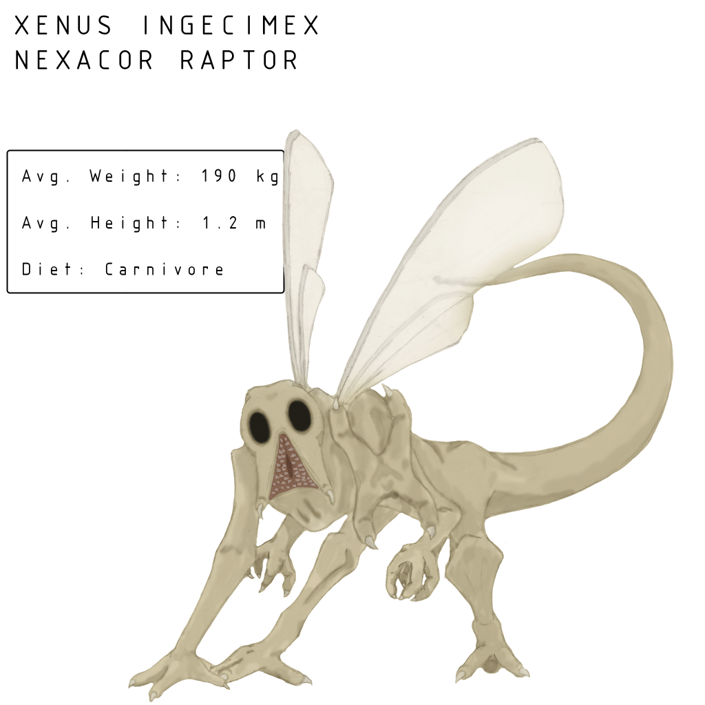 The raptor is perhaps most distinct from its fellow nexacors due to its keratinous wings, which, while not capable of providing sustained flight, greatly enhance the raptor’s running speed and jump height. Reports on both statistics vary wildly, but officially, raptors can reach speeds of up to 95 kilometers per hour and leap about 18 meters horizontally, or 8 meters vertically, depending on the atmospheric density and gravity of the environment.