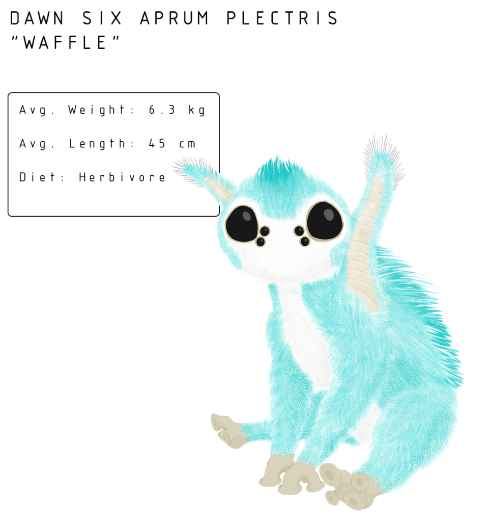 Because of the Empire’s brief stay on Dawn Six, not much is known about its wildlife outside anecdotal encounters and trap-cam footage. Aprum plectris is one of the few creatures Voyager Dawn’s biologists were able to study up close, as a result of one adventurous individual stowing away in Air Wing Lieutenant Goodman’s flight bag and capturing the hearts of Dawn’s crew under the adopted name, “Waffle”.