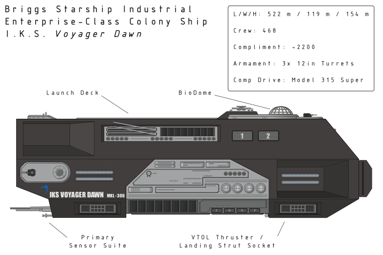Measuring in at 522 meters long, Voyager Dawn and its sister ships are the largest colony ships to date, larger even than most military craft. Dawn supports hundreds of crew and thousands of colonists with a self-sustaining hydroponics bay, colloquially known as the “Biodome”, as well as vast cargo bays, a variety of amenities, and a fleet of support craft.